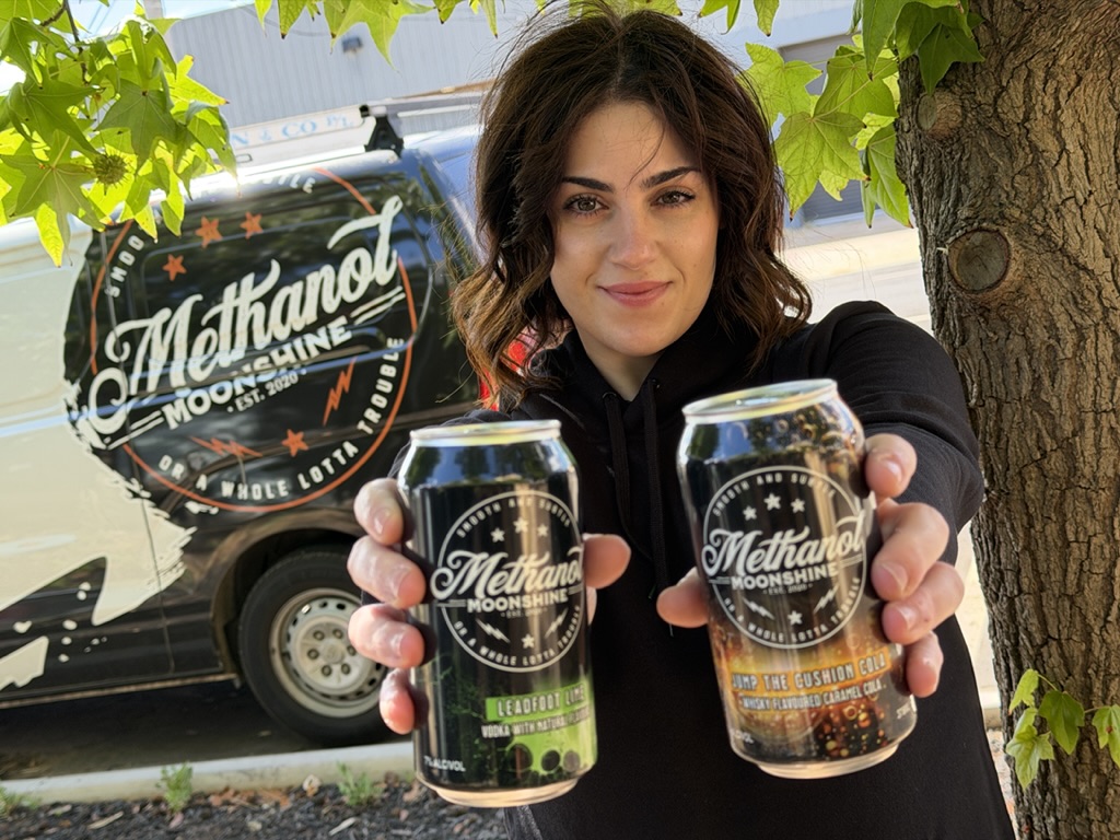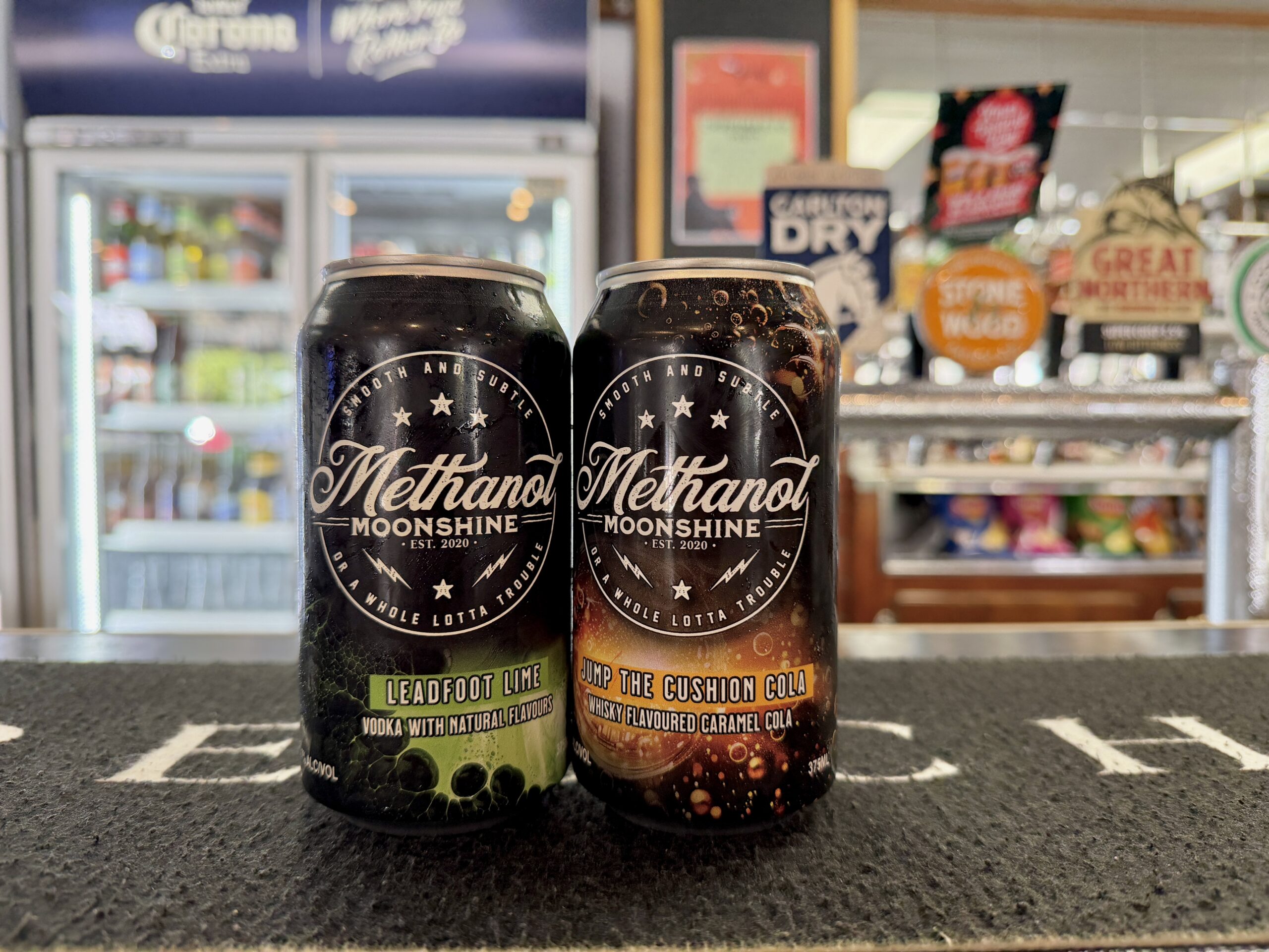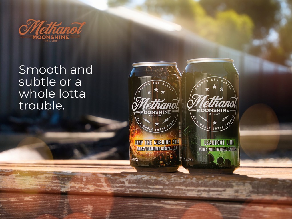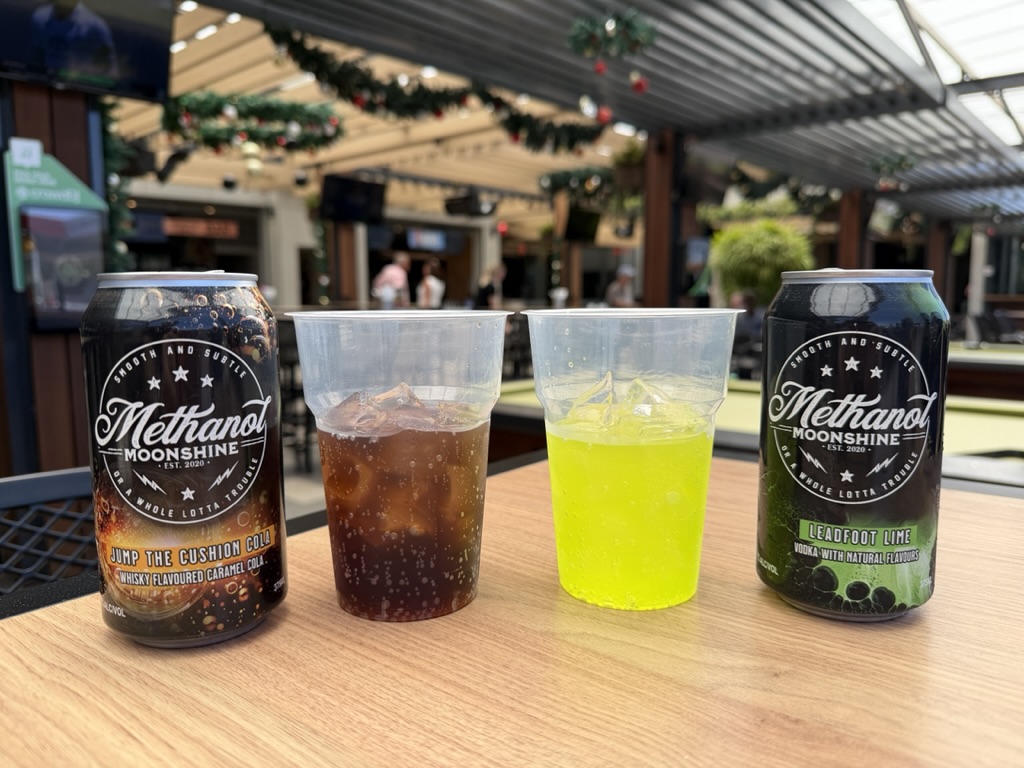 Try our new ready to drink Methanol Moonshine cocktails in a can! Two delicious flavours – Lime Vodka and soda and Whisky flavoured Caramel Cola!